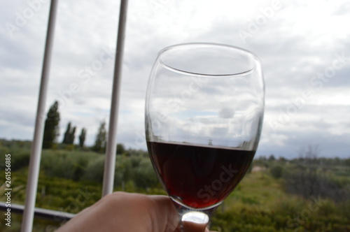 glass of wine on a background of vineyard