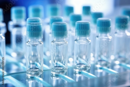 Glass vials for liquid samples. Laboratory equipment for dispensing fluid samples. Shallow depth of field.