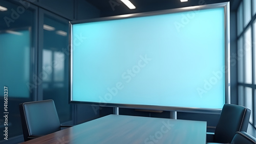 Glass whiteboard poster mockup in high-tech conference room with cool blue lighting and blurred luxury furniture.