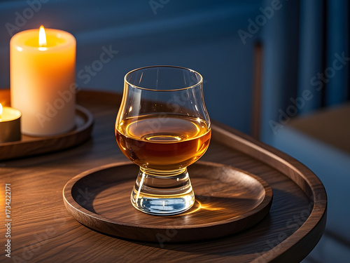 Glass with Brown Liquid on Wooden Coaster with Candle