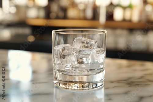Glass with Ice Cubes on Bar Counter in Soft Focus Background