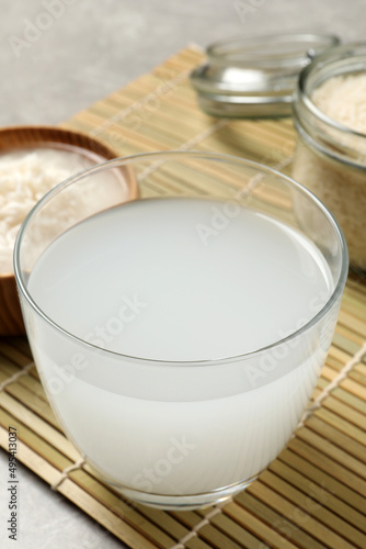 Glass with natural rice water on bamboo mat, closeup