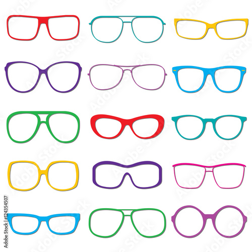 Glasses and sunglasses outline set isolated on white background. Colorful sunglasses silhouettes. Vector illustration.