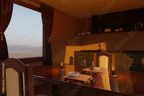 Glasses, candles on a wooden table in a cozy kitchen, filled with warm evening light