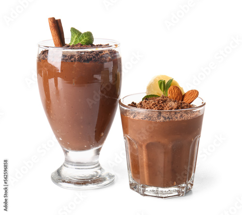 Glasses of chocolate pudding with almond, mint and cinnamon isolated on white background