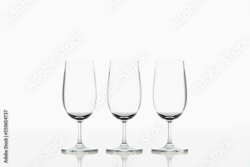 Glasses on a white isolated background. The concept of drinking wine, drinks in glasses. Using the correct drinking glasses. 3D render, 3D illustration.