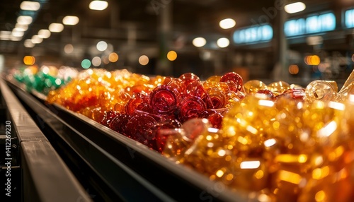 Glassware moving on a conveyor belt inside factory with industrial lighting, blurry