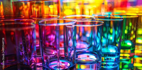 Glassware stacked in a prismatic arrangement reflects a spectrum of neon hues, creating a dazzling display of colors.