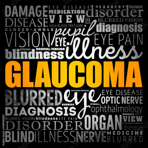 Glaucoma is a group of eye diseases that result in damage to the optic nerve (or retina) and cause vision loss, word cloud medical concept background