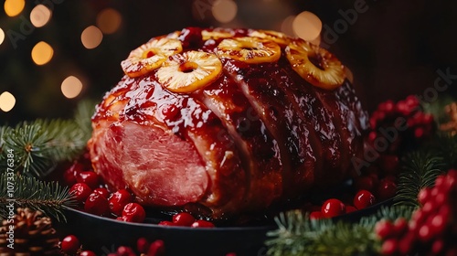 Glazed Christmas ham with pineapple rings, isolated on a cozy, deep background with red berries