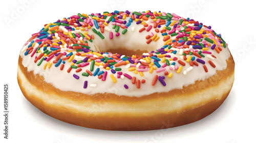 Glazed donut topped with colorful sprinkles. A round, delicious treat, coated in white icing and adorned with vibrant sprinkles