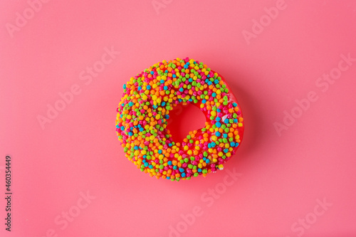 Glazed donut with strawberry, raspberry, tangerine flavor with pastry sprinkles on a pink background