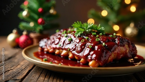 Glazed pork ribs beside miniature Christmas tree & toys , meat, brown, present