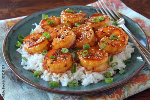Glazed Shrimp Served on Rice with Green Onions and Sesame Seeds