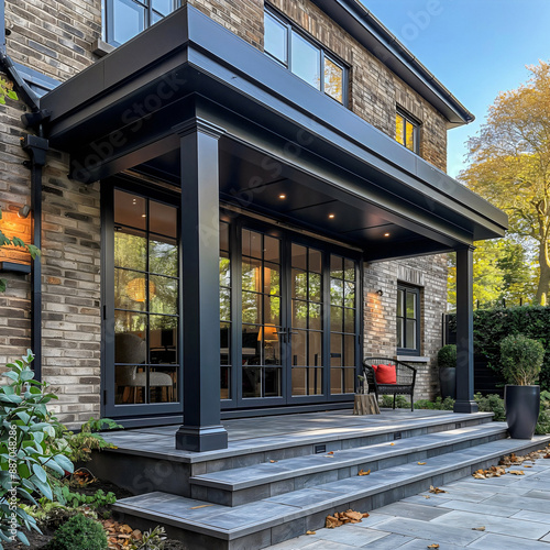 Glazed veranda with a flat roof on the external facade of an existing semi-detached house with glazing in a loft style