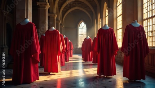 Gleaming choir robes hanging in a darkened hall, robes, stage