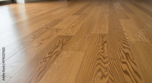 Gleaming light brown hardwood floor planks with natural wood grain patterns, reflecting ambient light, creating a warm and inviting interior background for modern home design.