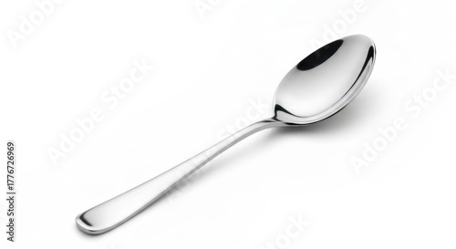 Gleaming silver spoon isolated on white, subtle shadow indicating depth and curvature