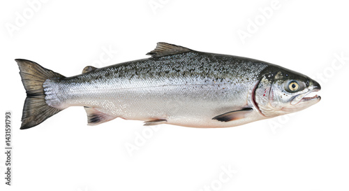 Gleaming silvery salmon with speckled patterns, isolated on a dark background in a side view