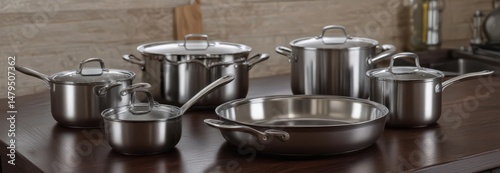 Gleaming stainless steel cookware set on dark wood countertop, design, utensils, pots