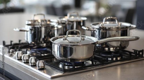 Gleaming stainless steel saucepans atop a modern gas cooktop