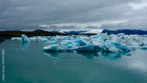 Gletscher Fjord und Gletscher Lagune. Kleine Eisstücke und riesige Eisberge - alles mit bewölktem Himmel.