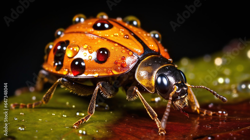 Glimmering ladybug on a leaf closeup