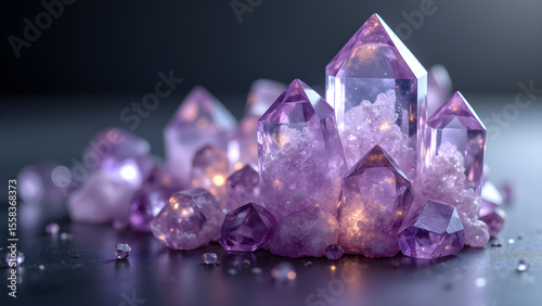 Glimmering mineral formations. Faceted structures illustrate silent, progressive elevation. Crystal, geology, abstract, texture.