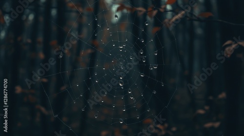 Glistening droplets hang delicately on a spider's web in a misty forest at dawn, creating a mystical atmosphere