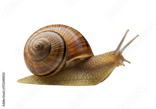 Glistening garden snail mid-crawl, twitching antennae, spiral shell, transparent background, raking light, glistening trail. Concept of natural wonder.