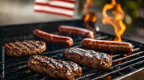 Glistening Grilled Sausages and Juicy Hamburger Steaks at a Mouthwatering Summer Barbeque Feast