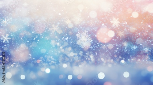 Glistening snowflakes fall with vibrant bokeh light background. Abstract festive pattern.