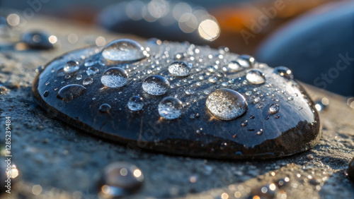 Glistening water droplets on smooth stone surface create serene atmosphere