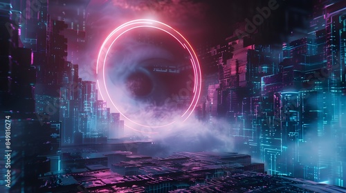 Glitch circle. Distorted glowing circle cyberpunk style. Futuristic round shape with TV interference effect. Design for promo music events, games, web, banners, backgrounds.