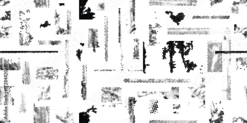 Glitch distorted grungy abstract forms . Halftone dots seamless pattern texture. Grange shapes .Grunge textured . Vector shapes with half tone dots .Screen print endless pattern texture