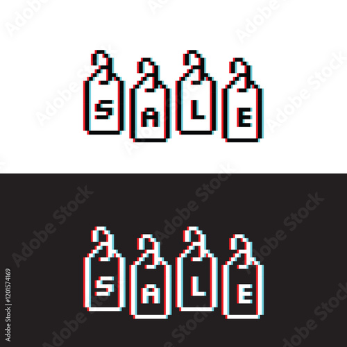 glitch effect pixel sale tag icon. Vector pixel art sale 8 bit for game company logo template