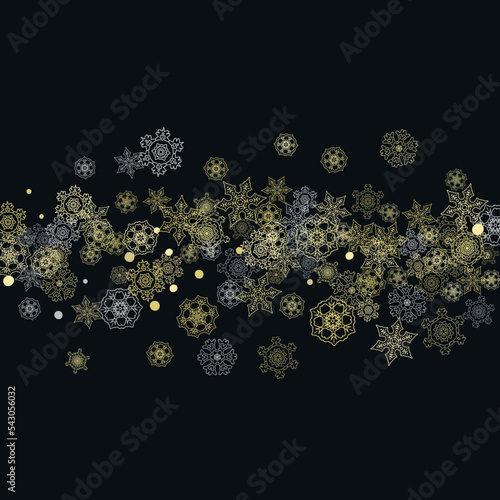 Glitter snowflakes frame on black background. Winter window. Shiny Christmas and New Year frame for gift certificate, ads, banners, flyers. Falling snow with golden glitter snowflakes for party invite