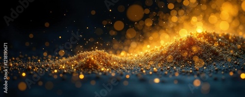 Glittering gold dust settles on dark canvas, radiating an ethereal glow, gold, glowing