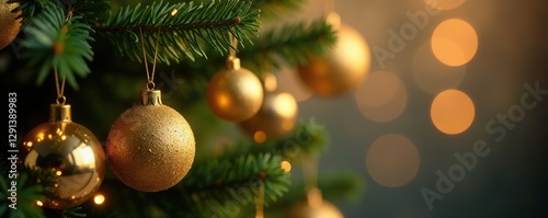 Glittering golden ornaments dangle from a branch, christmas tree, decoration, garland