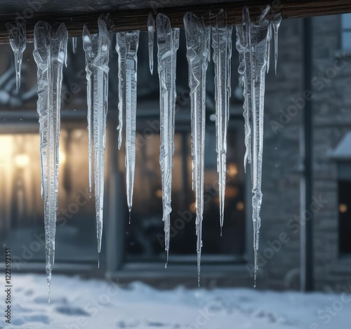 Glittering icicles hanging from a frosty windowpane, wintery scenery, frosty windows