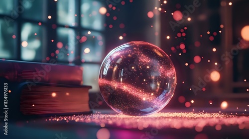 Glittering magenta sparkles with elegant bokeh swirling around a mystic orb in a dimly lit study