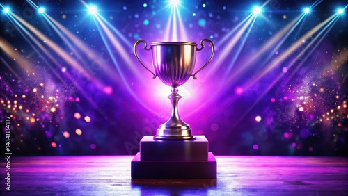 Glittering trophy sits atop a pedestal, surrounded by vibrant purple illumination that casts an otherworldly glow on its polished surface, stage, celebration