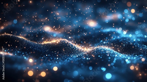 Glittering wave of light particles creating a mesmerizing abstract background with blue and gold tones