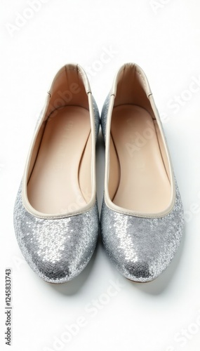 Glittery silver ballet flat shoes on white background with clipping path, silver, glittery, isolated