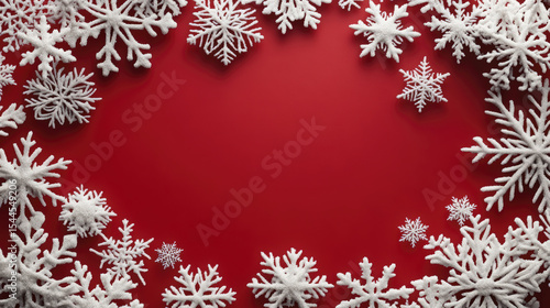 Glittery white snowflakes border a simple red background, creating a festive frame for holiday cheer