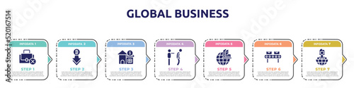 global business concept infographic design template. included unemployed, dec, reit, fired, headquarters, manufacture, entrepreneur icons and 7 option or steps.