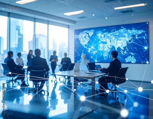 Global business meeting, network map displayed