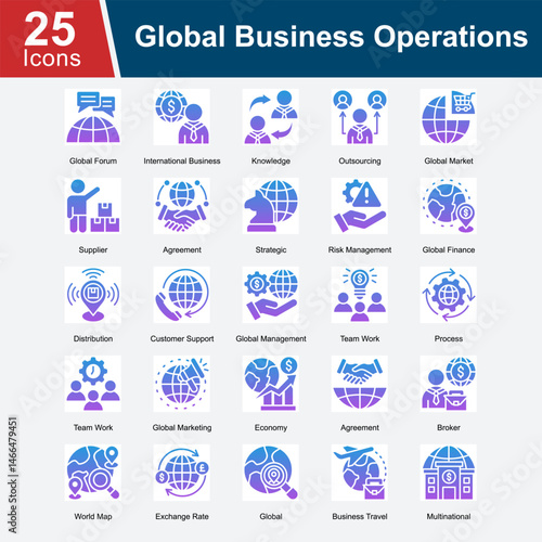 Global Business Operations is a collection of icons illustrating international business processes, outsourcing strategies, global supply chain management, risk management, and the dynamics of global.