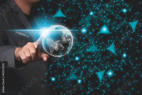 Global communication and technology concept , Businessman touching on earth with connection line.