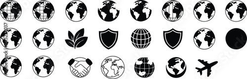 Global Connection & Environmental Protection Icon Set: Earth, Security Shields, Nature, Handshake & Travel Vector Symbols
